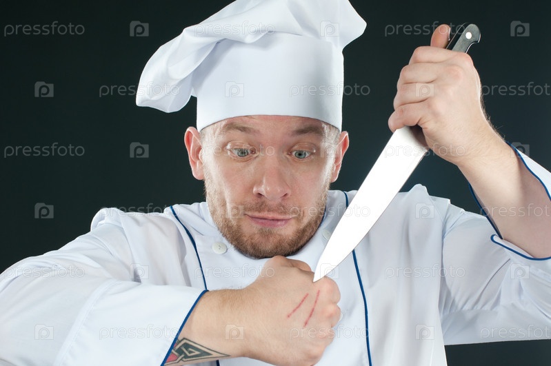 Удивленный повар с кухонным ножом в руках