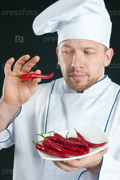 Шеф-повар, с недоверием смотрит на перец чили в руках, на черном фоне