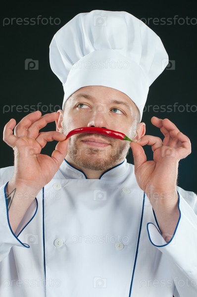 Шеф-повар, наслаждающийся ароматом перца чили, на черном фоне