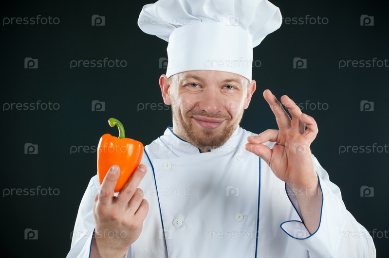 Шеф-повар с болгарским перцем в руках на черном фоне
