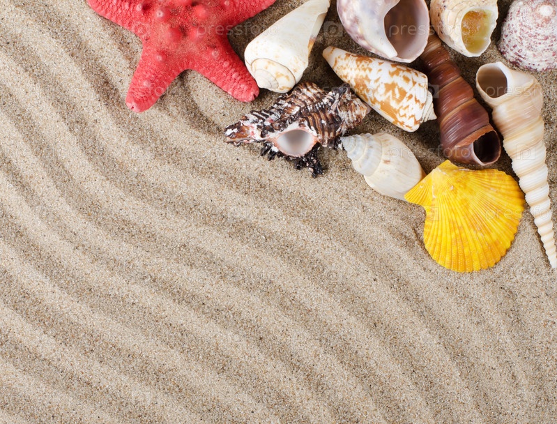 Разнообразие морских ракушек на песке. Крупный план