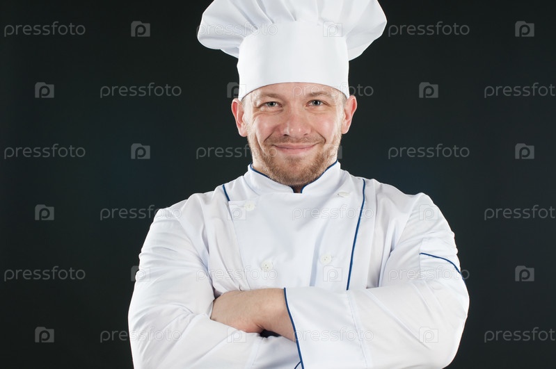 Улыбающийся шеф-повар в униформе на темном фоне