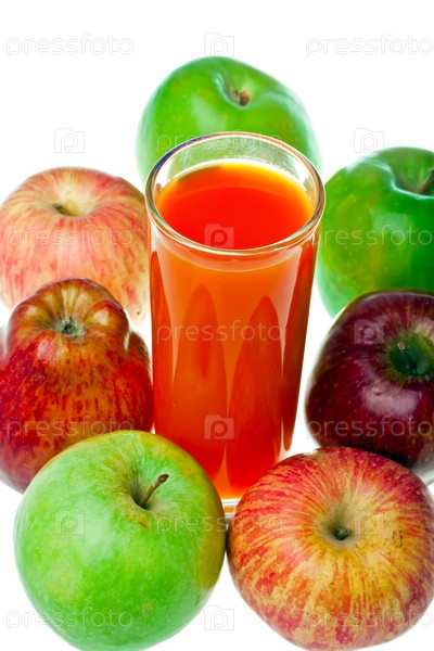 Яблоки и сок в стакане, на белом фоне