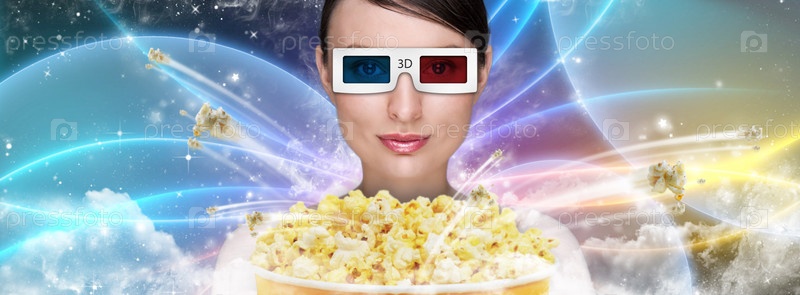 Портрет молодой стильной женщины в 3D-очках и тарелке попкорна