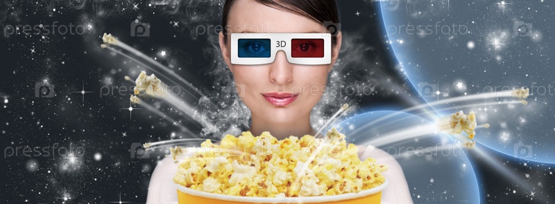 Портрет молодой стильной женщины в 3D-очках на фоне космоса