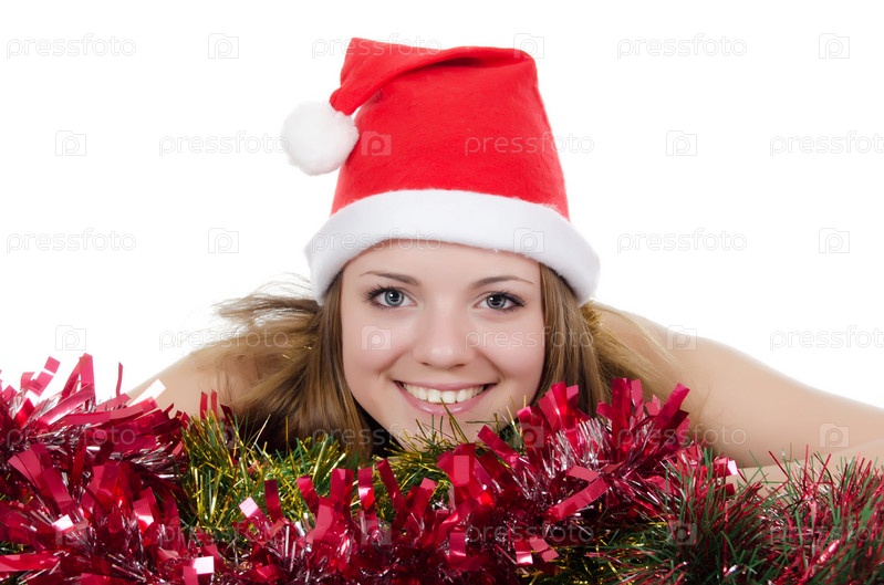 Девушка в новогодней шапке с мишурой на белом фоне
