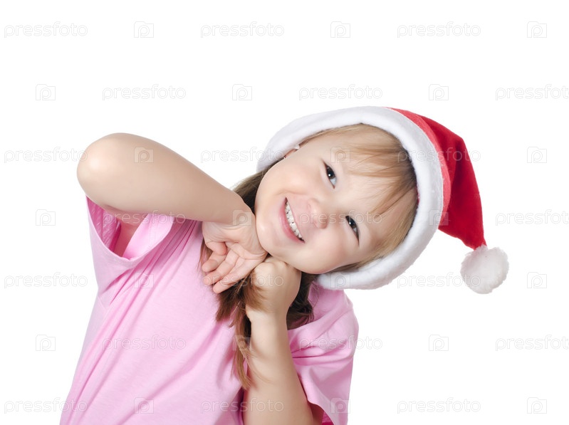 Девочка в новогодней шапке на белом фоне