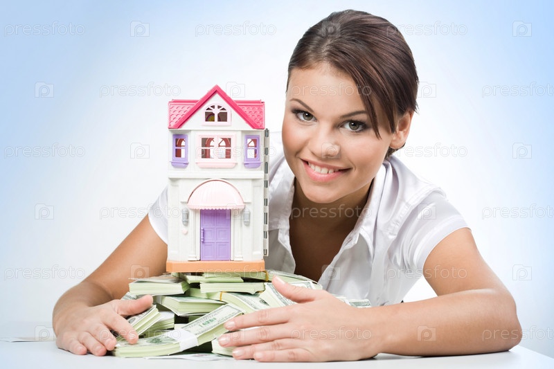 Портрет красивой женщины, касающейся кучи денег с игрушечным домом на вершине