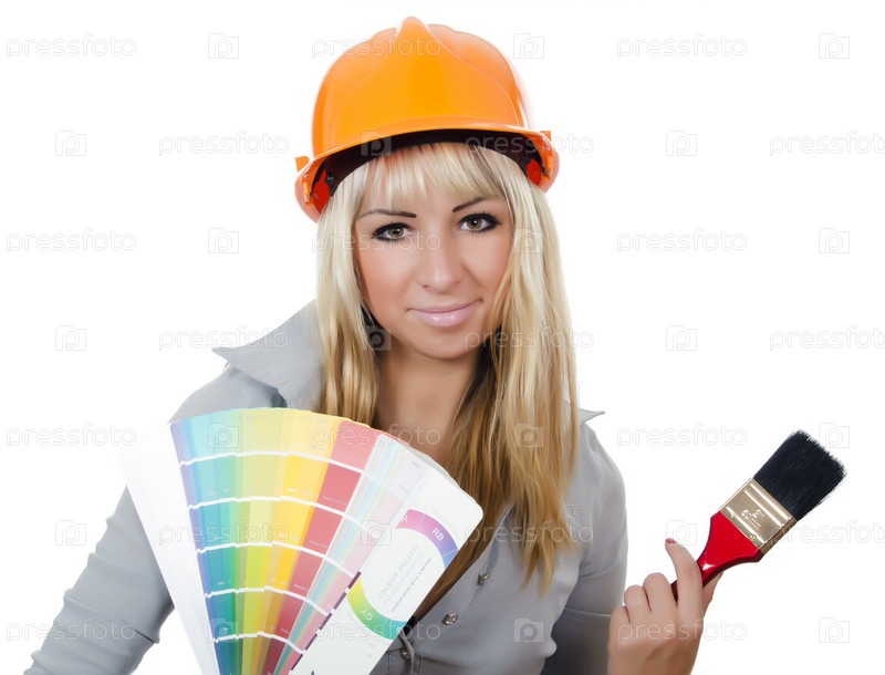 Девушка в оранжевой каске на белом фоне