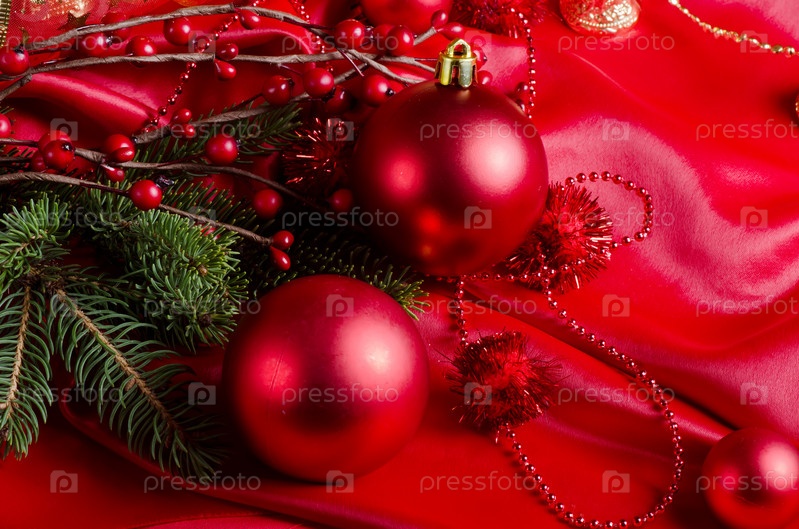 Красные елочные шары, еловая ветвь и ветка с ягодами на красном фоне
