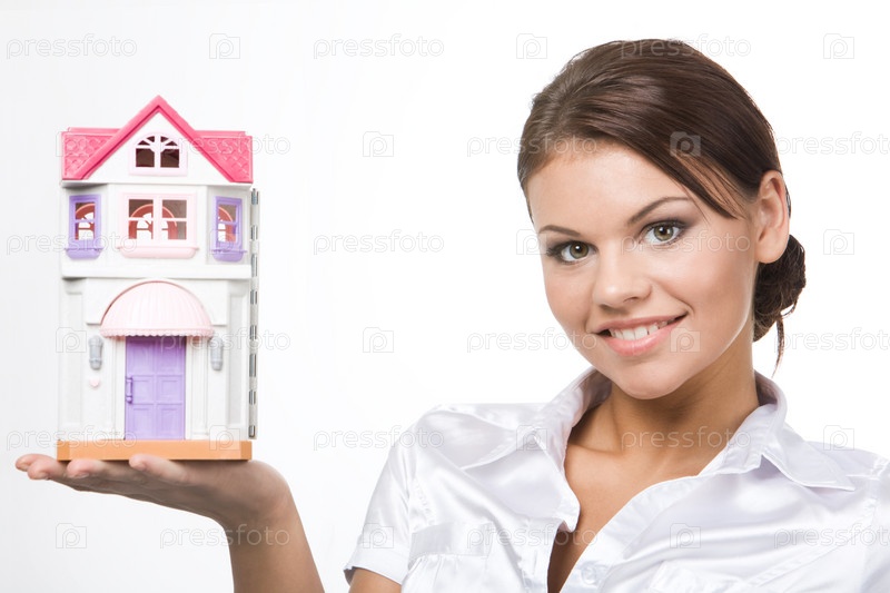 Изображение красивой женщины, держащей игрушечный дом на ладони