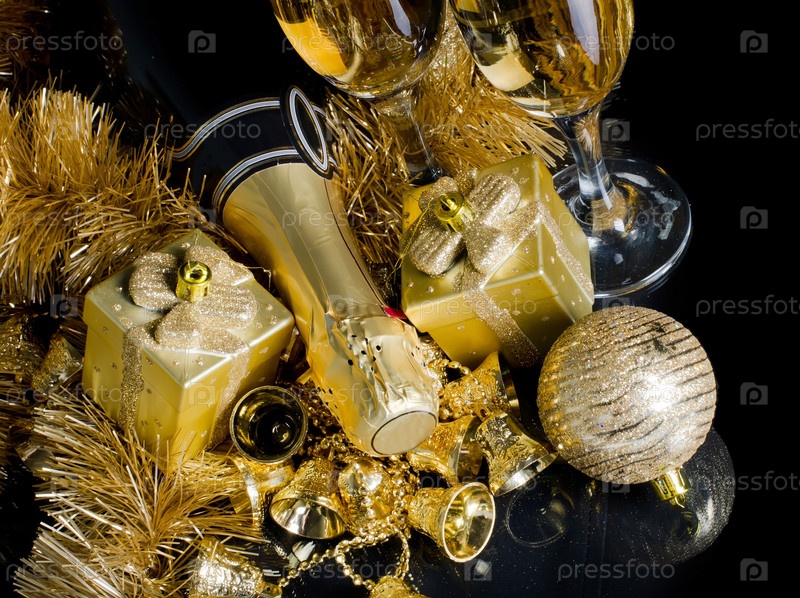 Шампанское и рождественские украшения на черном фоне