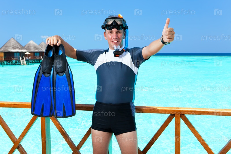 Молодой спортивный человек с ластами, маской и трубкой у океана на Мальдивских Островах показывает класс