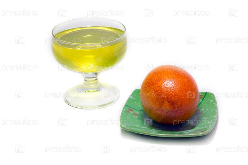Желтый желе, но прозрачное стекло и оранжевый на зеленой тарелке на белом фоне