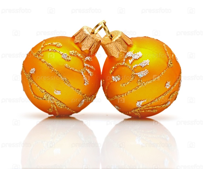 Два золотых новогодних шара на белом фоне