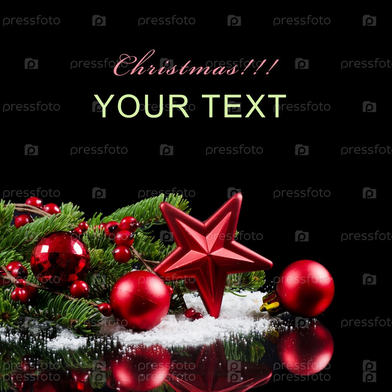 Новогодние украшения, еловая ветка и место для текста на черном фоне