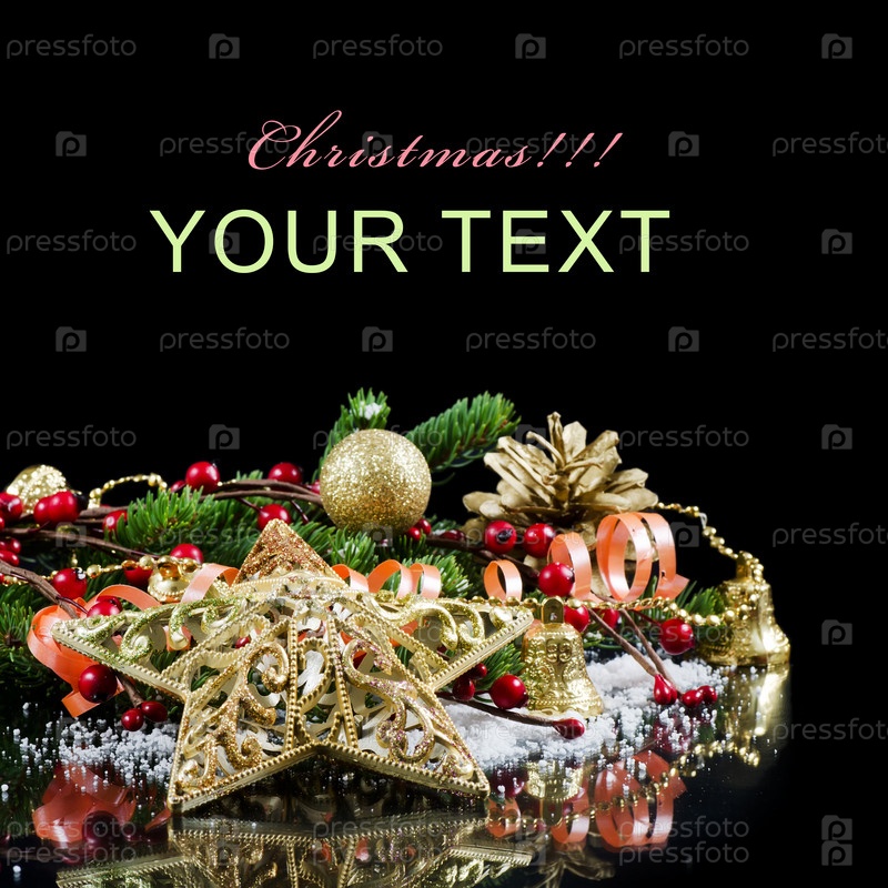 Новогодние украшения, еловая ветка и место для текста на черном фоне