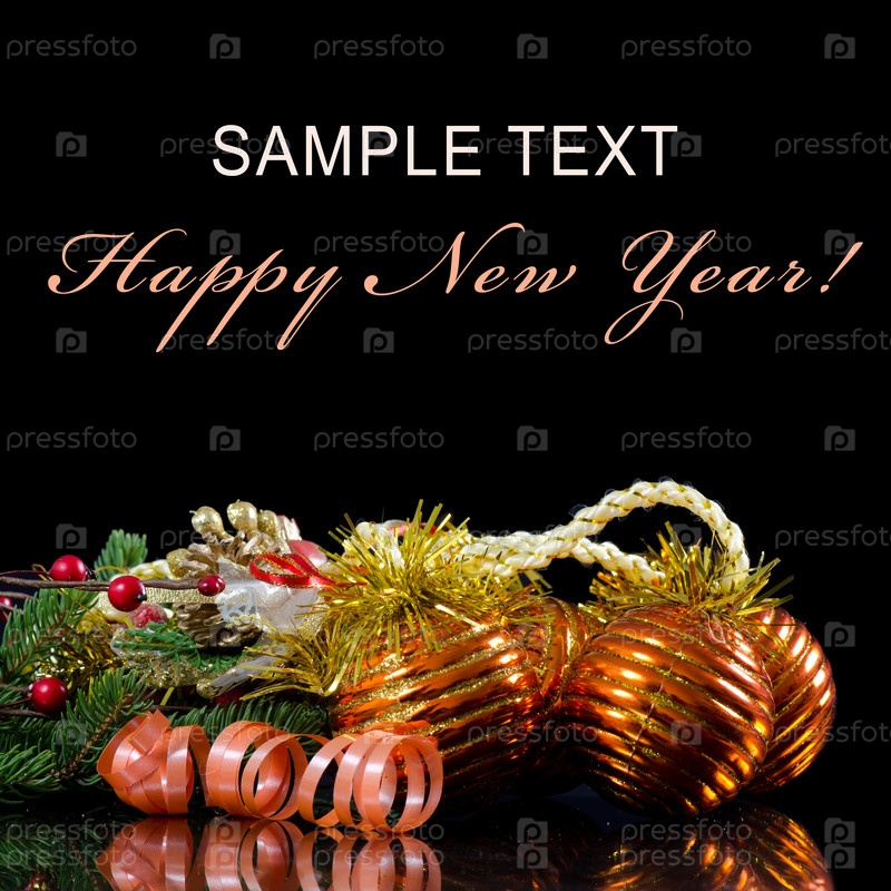Новогодние украшения, еловая ветка и место для текста на черном фоне