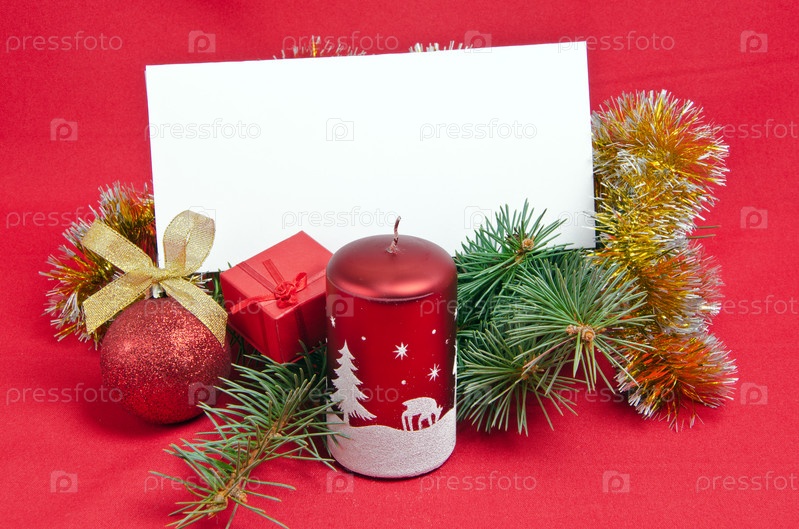 Рождественские украшения со свечой, веточкой ели и подарком на красном фоне