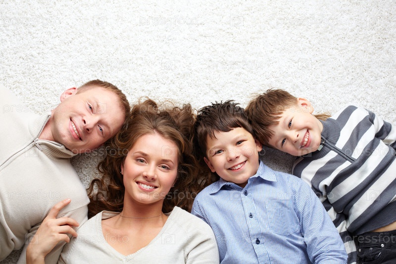 Семья из четырех человек, улыбаются в камеру