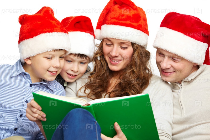 Семья из четырех человек в новогодних шапках, читают книгу