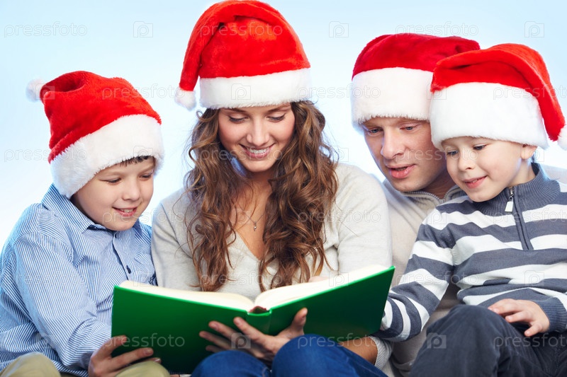 Семья из четырех человек в новогодних шапках, читают книгу