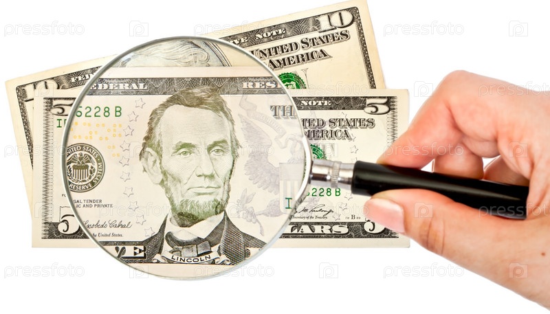 Увеличительное стекло в руке и доллары