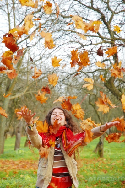 Женщина, бросающая желтые листья в воздух