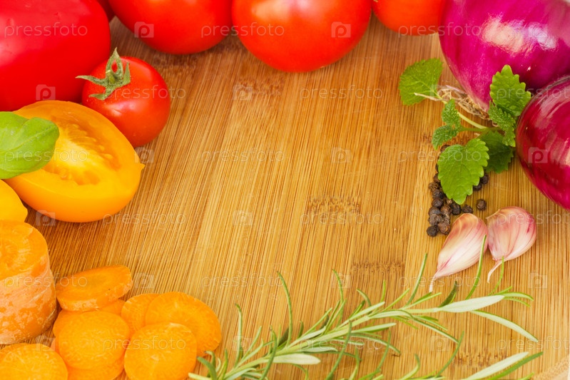 Овощи и специи на деревянном столе