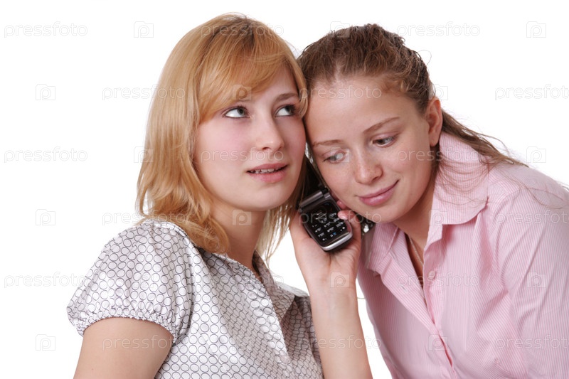 Две девушки слушают одного собеседника по мобильному телефону