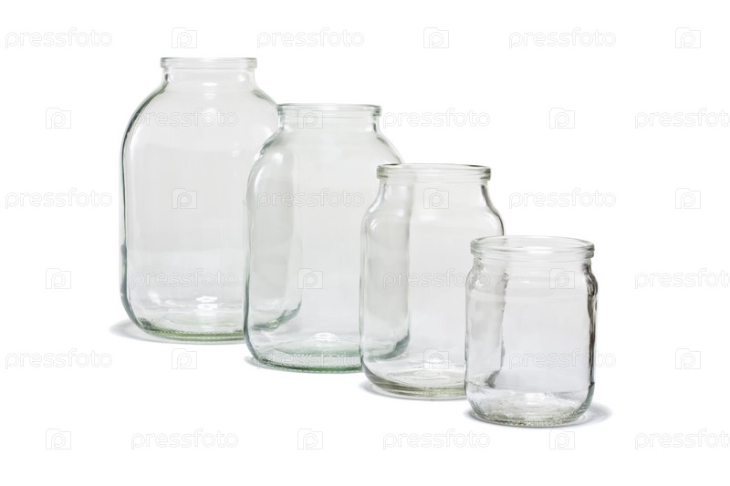 Шесть пустых стеклянных банок различного размера, изолированных на белом фоне
