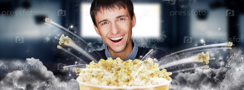 Молодой восторженный человек в кинотеатре ест взрывающийся попкорн