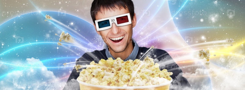 Молодой человек ест попкорн и смотрит 3D-фильм