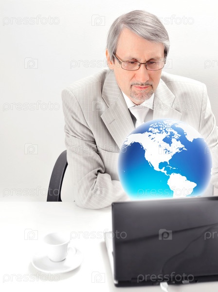Пожилой бизнесмен с ноутбуком на сером фоне