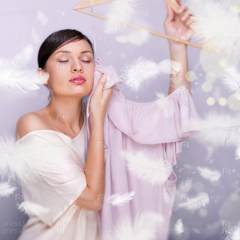 Портрет женщины, подбирающей новую одежду, на голубом фоне с перьями вокруг. Мягкая текстильная концепция