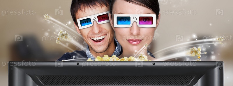 Молодая пара ест попкорн и смотрит 3D-фильм на телевизоре