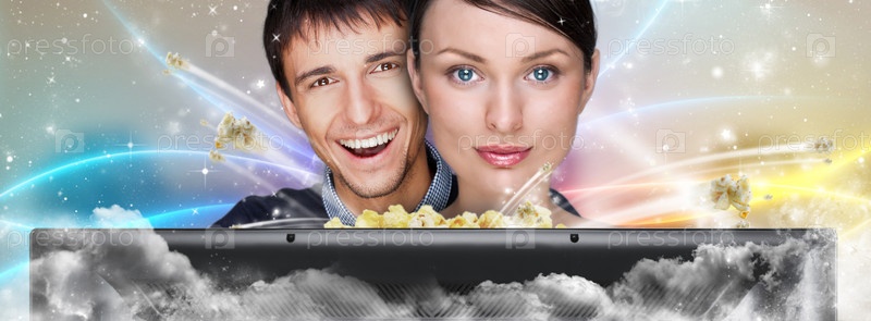 Молодая пара ест попкорн и смотрит фильм по телевизору