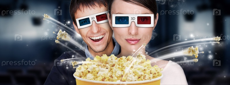 Молодая пара ест попкорн и смотрит 3D-фильм