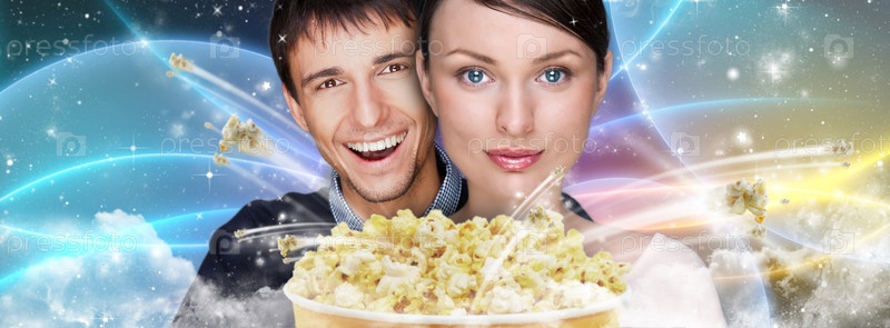 Молодая пара ест попкорн и смотрит фильм