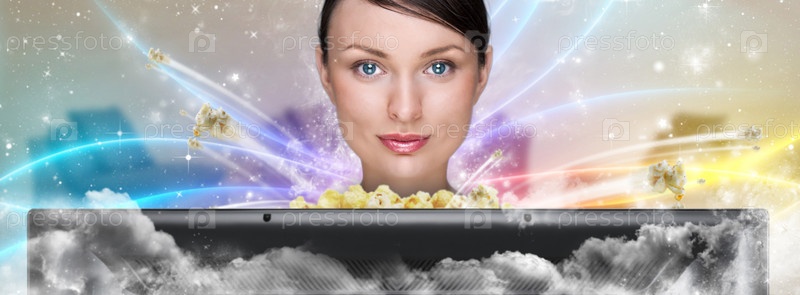 Девушка ест попкорн и смотрит телевизор
