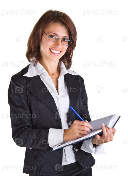 Красивая деловая женщина с открытым блокнотом, на белом фоне