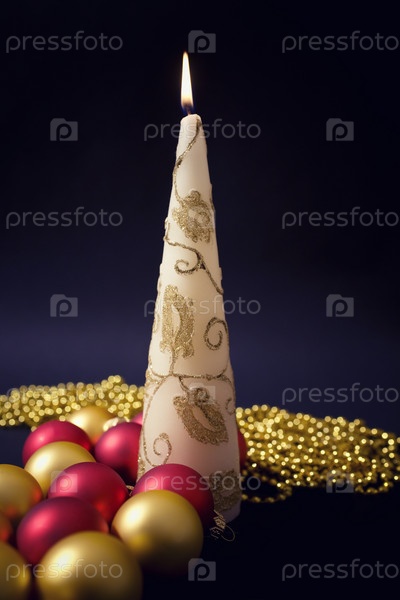 Рождественские украшения и свеча на черном фоне