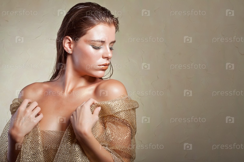 Красивая загорелая женщина в платье золотого цвета