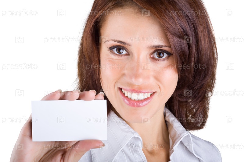 Красивая деловая женщина показывает визитную карточку, изолированную на белом фоне