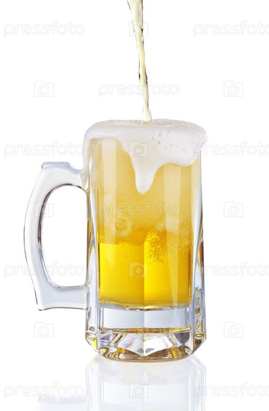 Пиво льется в кружку на белом фоне