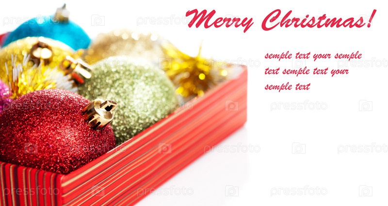 Рождественские шары в коробке на белом фоне