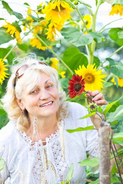 Пожилая женщина с цветами в саду