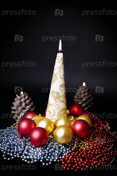 Новогодняя открытка со свечками и шариками вокруг