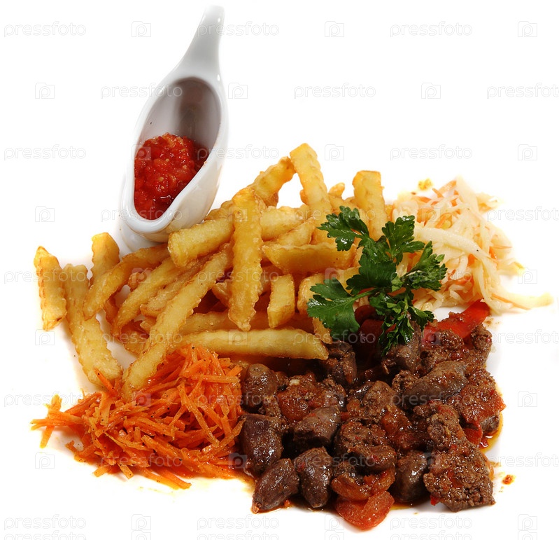Картофель-фри, обжаренная печень, соус в соуснике