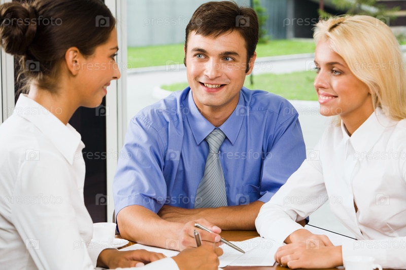 Три молодых специалиста собрались за одним столом, чтобы обсудить важный проект